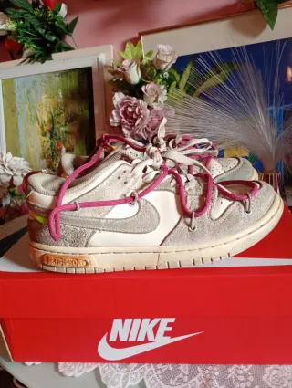 Scarpe Nike Dunk Low in una colorazione beige e bianca. - Design distintivo con lacci rosa. - Dettagli in suede e pelle. - Logo Nike sul lato.