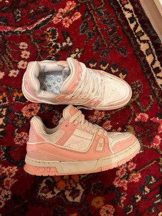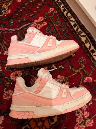 Sneakers Louis Vuitton in color block rosa e bianco. - Design iconico. - Dettagli monogram. - Suola in gomma.