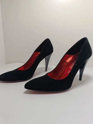 Eleganti scarpe con tacco a spillo. - Materiale scamosciato. - Cinturino alla caviglia con chiusura a fibbia. - Punta affilata.