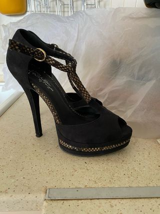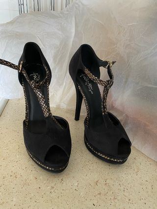 Eleganti sandali da donna con un design audace. - Tacco alto 13 cm. - Plateau di 2 cm. - Dettagli con fantasia pitonata. - Cinturino alla caviglia regolabile.