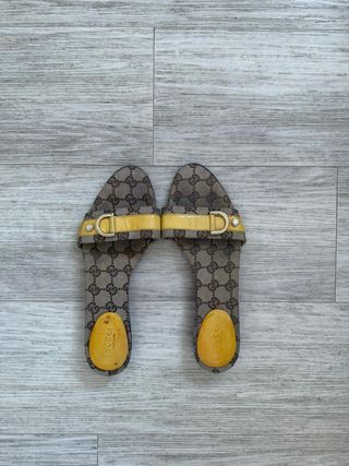 Eleganti sandali Gucci con l'iconico monogramma. - Tomaia in tessuto GG Supreme. - Dettaglio in pelle gialla. - Fibbia dorata con logo. - Suola interna in pelle con logo.