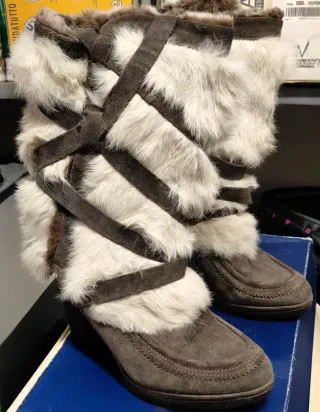 Eleganti stivaletti invernali da donna, perfetti per le giornate più fredde. Realizzati con un design unico che combina materiali caldi e accoglienti. - Dettagli in pelliccia sintetica. - Fasce decorative incrociate. - Materiale scamosciato.