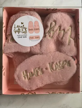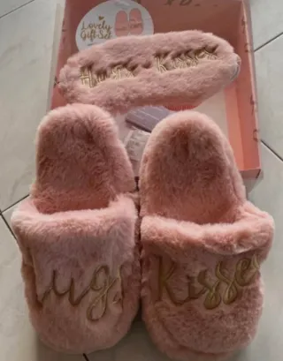 Set composto da pantofole morbide e mascherina per dormire. Tessuto teddy, colore rosa, ricami oro, calde e morbidissime, nuove con scatola originale, carina anche da regalare, marca Hugy Kissey, TU, pantofole adatte circa dal numero 35 al 37, lunghezza suola cm 25 ( art arma pinobianco1 basso) W. w - Pantofole in tessuto teddy. - Mascherina per dormire coordinata. - Scritta Hugs Kisses ricamata sulle pantofole e sulla mascherina.