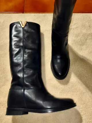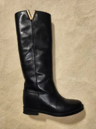 Eleganti stivali in vera pelle. - Dettaglio metallico a V sulla parte superiore. - Fodera interna in tessuto. - Suola in gomma.