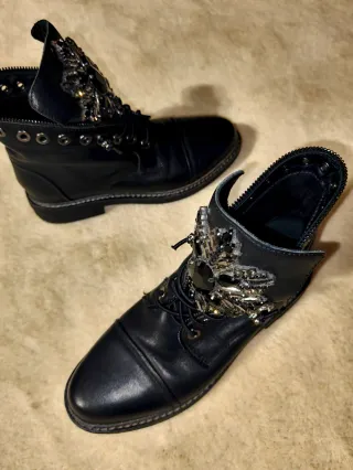 Tronchetto in vera pelle, un modello elegante e versatile. - Dettagli con strass e zip completamente fatti a mano - Allacciatura frontale. - Suola robusta.