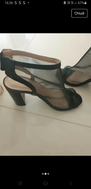 Eleganti scarpe con tacco. - Materiale esterno in tessuto. - Suola in cuoio.