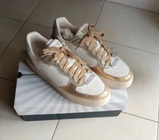 Svendo sneakers Nero Giardini donna n. 40 in pelle con fascia laterale e lacci color bronzo. Sneakers estremamente comode da indossare. MADE IN ITALY realizzate con materiali di alta qualità. Ottime condizioni in quanto calzate un paio di volte. Pagate scontate euro 104,65