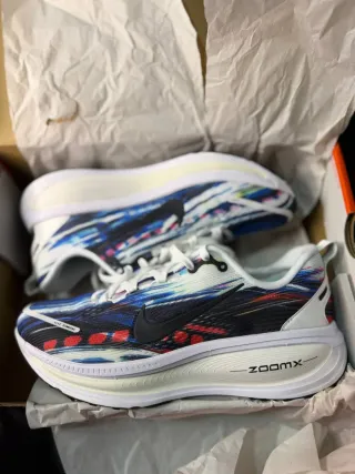 Scarpe da running Nike Vomero 18 SE con un design vivace e colorato. - Tomaia con stampa astratta multicolore. - Dettagli neri a contrasto, incluso lo swoosh Nike. - Intersuola con tecnologia ZoomX per ammortizzazione. - Inserti rossi e blu sulla tomaia.