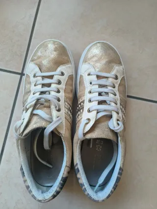 Sneakers basse Geox con un design accattivante. - Tomaia in ecopelle con dettagli laminati oro. - Inserti in ecopelle bianca. - Allacciatura frontale con lacci bianchi. - Dettagli decorativi laterali. - Qualche difetto di usura ma ancora in buone condizioni. Misura 39. Consegna anche a mano Sesto San Giovanni-Milano
