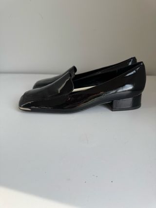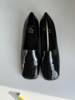 Eleganti mocassini Calvin Klein in vernice nera. - Toma quadrata con inserto metallico. - Tacco basso squadrato.