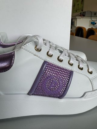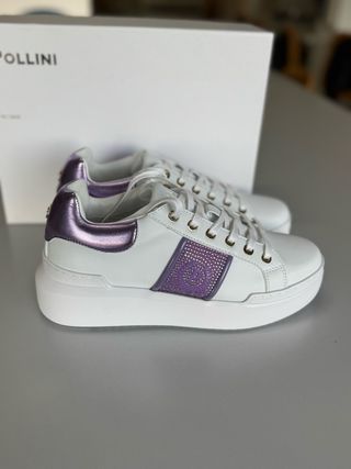 Sneakers Pollini da donna, un modello elegante e alla moda. - Tomaia in pelle bianca. - Dettagli metallizzati viola. - Inserti decorativi con strass viola. - Suola platform bianca.