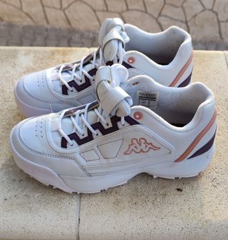 Scarpe Kappa modello Rave, ideali per l'allenamento. Scarpe Kappa da training taglio semi alto. Comode in ottime condizioni. Finta pelle alta qualità Kappa - Tomaia in finta pelle bianca. - Dettagli in color bianco e rosa pesca. - Logo Kappa ricamato sui lati.
