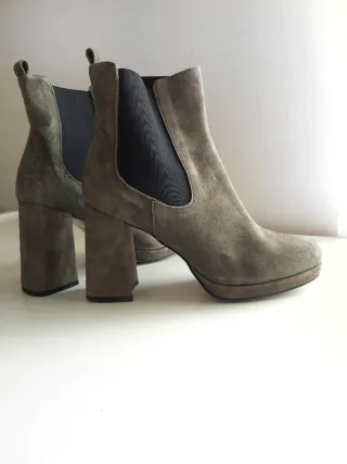 Eleganti stivaletti da donna con tacco largo e plateau. Realizzati in camoscio, sono perfetti per completare ogni outfit. - Materiale: camoscio - Dettaglio: elastico laterale - Suola: plateau