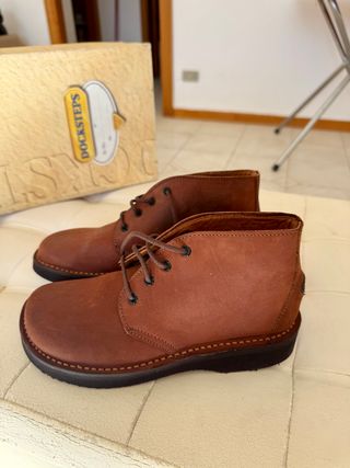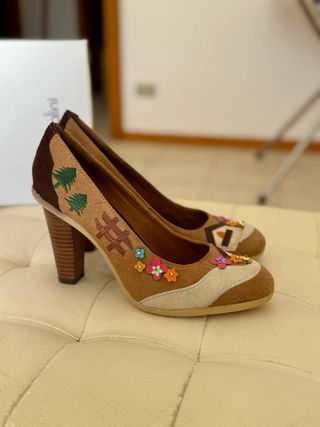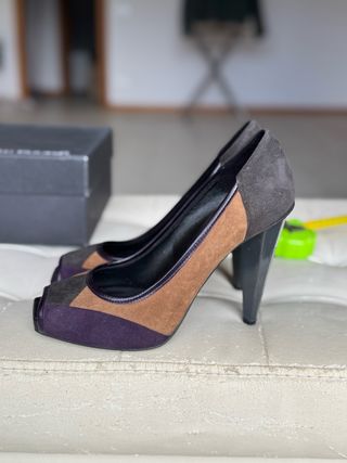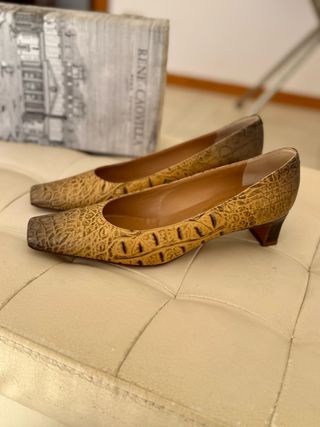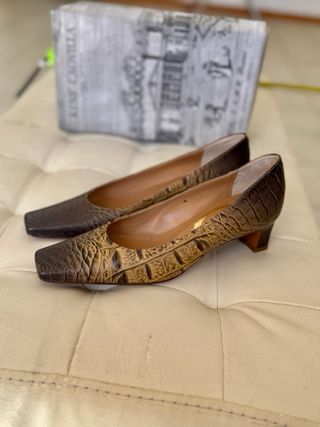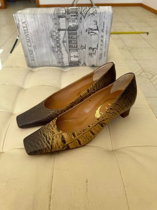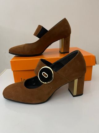 Scarpe utilizzate solo 2 volte. Sono in camoscio color cuoio. Tacco grosso 7. Presentano sulla fascia dorsale fibbia decorativa nera con contorno color oro più, dal lato opposto, inserto elasticizzato.
