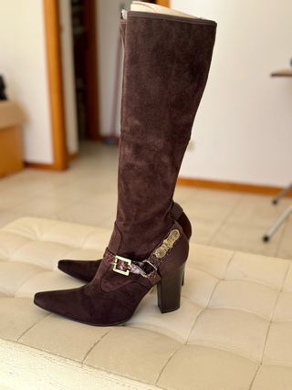 Eleganti stivali alti in camoscio marrone. - Materiale scamosciato morbido. - Dettaglio cinturino in pitone con fibbia dorata. - Tacco robusto e punta affusolata.