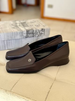Eleganti mocassini da donna René Caovilla. - Modello a punta quadrata. - Tacco basso a zeppa. - Logo metallico sul davanti.