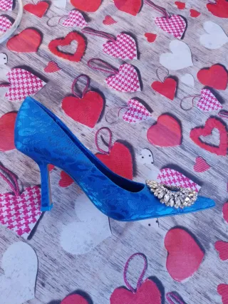 Eleganti scarpe da donna Zara con un tocco scintillante in seta colore blu/azzurro leopardato e fiore in strass, nuove da magazzino mai indossate. - Decorazione frontale con strass. - Tacco sottile per un look sofisticato 8,5cm. - Design a punta affusolata. - Misura/taglia 37.