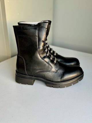 Stivaletto alla caviglia con zeppa interna 8cm, un modello elegante e versatile. - Logo Armani Jeans sul lato. - Chiusura con lacci e velcro. - Inserti in camoscio e pelle. - Zeppa interna per un comfort aggiuntivo.