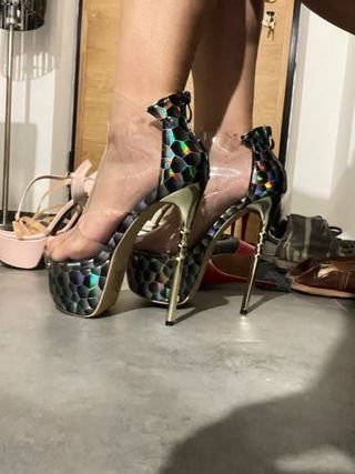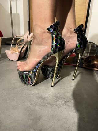Scarpe con tacco alto, perfette per pole dance o animazione. Nude look totale sul davanti e verde cangiante i dettagli. Veste un 40-41 - Design con plateau. - Dettagli in oro e nero. - Tomaia trasparente.