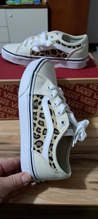 Scarpe Vans con un accattivante design. - Tomaia in tessuto color beige. - Dettagli con stampa leopardata. - Iconico sidestripe Vans bianco.
