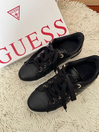 Espléndidos sneakers de la marca GUESS. Sneakers con cordones y plataforma (3,5 cm) y hermosos detalles dorados con brillantina. 🖤 En muy buen estado y se venden con caja original. Presentan un pequeño defecto debido al desgaste, como se muestra en la última foto. Precio original: 99,90 €