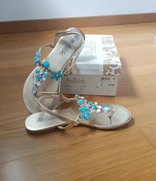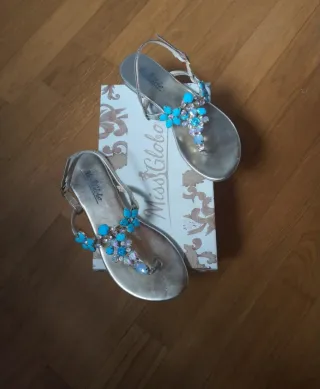 Sandali infradito Miss Globo con decorazioni floreali. - Oro con decorazioni con pietre azzurre e strass. - Cinturino regolabile. Eleganti e perfetti per l'estate. Integro e in buone condizioni. Taglia 37. Con scatola.