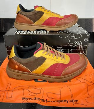 Scarpe da uomo del marchio ART, con un design patchwork in vari toni. Combinazione di colori marrone, rosso e giallo. Materiali diversi all'esterno. Chiusura con lacci.