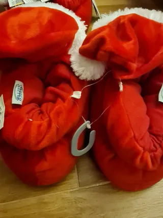 Morbide pantofole a tema natalizio. - Design a forma di Babbo Natale. - Dettagli in peluche bianco e rosso.