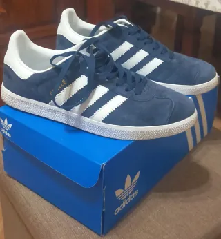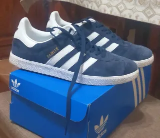 Scarpe Adidas Gazelle in camoscio blu con dettagli bianchi. Usate solo una volta. - Design classico. - Tre strisce Adidas laterali. - Logo Gazelle dorato sul lato.