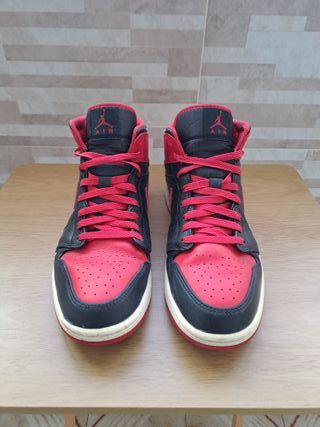 Scarpe da ginnastica Jordan 1 Mid. - Design alto. - Combinazione di colori bianco, nero e rosso. - Logo Jordan Wings sull'area del colletto.