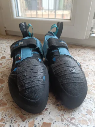 Scarponi da arrampicata Scarpa Instinct VSR. - Design moderno con inserti blu. - Chiusura a velcro per una calzata personalizzata. - Logo Scarpa sul tallone e sulla punta.