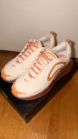Scarpe Nike Air Max 720 con una combinazione di colori arancione e bianco. - Design moderno e accattivante. - Suola con unità Air Max visibile per un'ammortizzazione reattiva.