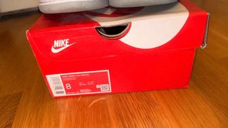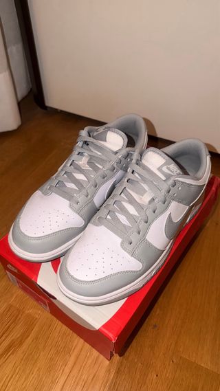 Scarpe Nike Dunk Low in colorazione argento e bianco. Modello retro. - Taglia EU 41. - Design iconico. - Tomaia in pelle.