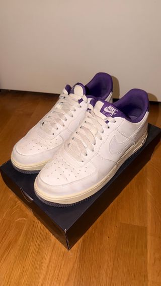Scarpe Nike Air Force 1. - Tomaia in pelle bianca. - Dettagli interni viola. - Suola in gomma.