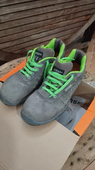 Scarpe antinfortunistiche di marca Base. - Tomaia in materiale scamosciato. - Inserti in tessuto tecnico. - Lacci di colore verde brillante. - Suola in gomma. - Logo Base visibile sulla linguetta e sul lato.