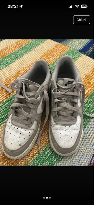 Scarpe Nike Air Force 1 usate, con una combinazione di colori grigio e bianco. - Design classico. - Tomaia in pelle e tessuto. - Suola in gomma.