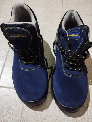 Scarpe antinfortunistiche Goodyear. - Tomaia in nabuk blu. - Inserti neri. - Lacci neri e gialli. - Suola in gomma. - Protezione punta rinforzata.
