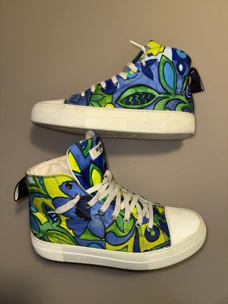 Sneakers Moschino , modello basket in tela con stampa floreale in col. Blu e verde - Modello alto. - Suola bianca. - Chiusura con lacci.