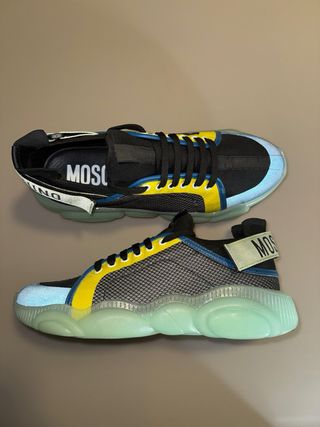 Sneakers Moschino con un design moderno e accattivante. - Tomaia in mesh traspirante - Dettagli in giallo e blu - Suola chunky in gomma trasparente