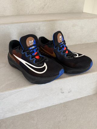 Scarpe da corsa Nike Zoomfly 5. - Design moderno con dettagli in blu e marrone. - Logo Nike bianco sul lato. - Tomaia in mesh traspirante.