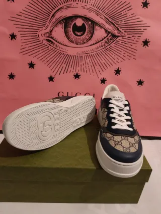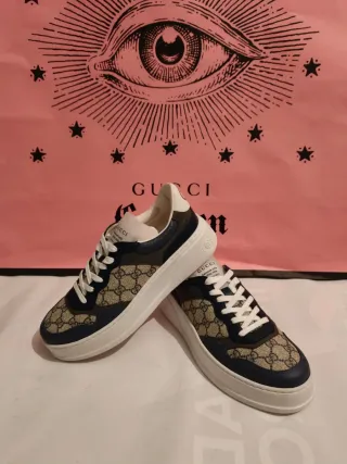 Scarpe Gucci originali in ottime condizioni. Modello unisex con design distintivo. - Tomaia in tela GG Supreme. - Dettagli in pelle blu. - Suola in gomma bianca.