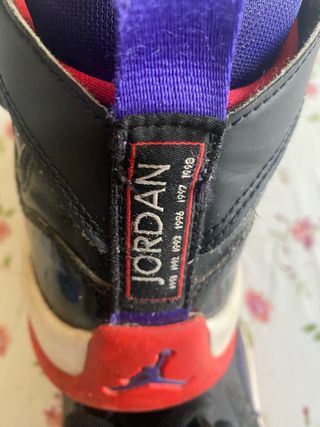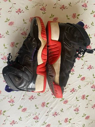 Scarpe Jordan usate, taglia 39. Design iconico e dettagli curati. - Tomaia in pelle lucida e tessuto. - Dettagli rossi e viola. - Suola in gomma. #scarpejordan #jordan29 #scarpeusate #basketballshoes #modasneakers