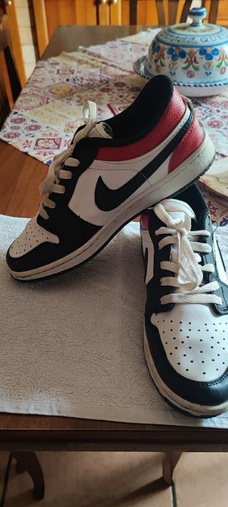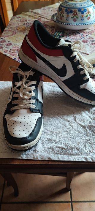 Vendo un paio di scarpe da ginnastica Nike Air Jordan 1 Low. Sono di colore nero e rosso, misura 40. Le scarpe presentano un aspetto leggermente usato ma sono ancora in buone condizioni.sono senza scatola.