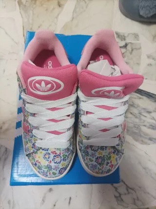 Scarpe Adidas per bambina con una vivace stampa floreale su sfondo rosa. - Design con chiusura a lacci bianchi. - Logo Adidas a trifoglio sul tallone. - Interno foderato in tessuto rosa.