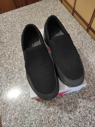 Scarpe Skechers da uomo in colore nero, taglia 45. Indossate pochissime volte da persona con difficoltà motorie. La scarpa e la suola sono in perfette condizioni (praticamente come se non fossero mai state usate). Scatola non originale
