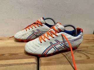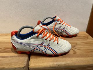 Scarpe da calcio Asics LX200 in ottime condizioni. - Colore bianco con dettagli arancioni e blu. - Taglia 41.
