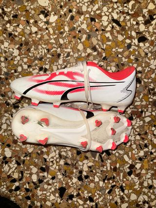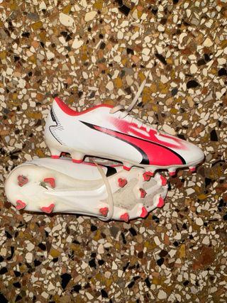 Scarpe da calcio Puma originali. - Design moderno con dettagli rosa e neri. - Suola con tacchetti per campi in erba.