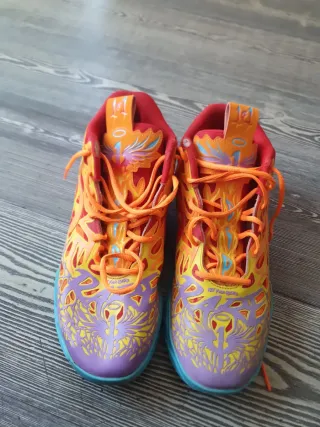 Scarpe da basket Puma MB.04 Lamelo Ball. - Design accattivante con sfumature arancioni e viola. - Tomaia con dettagli a fiamma e motivi grafici. - Suola bicolore con inserti azzurri e rosa.