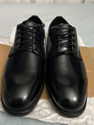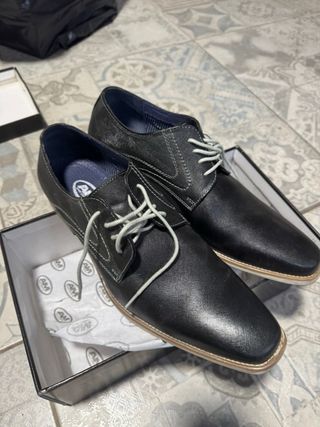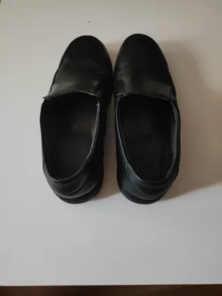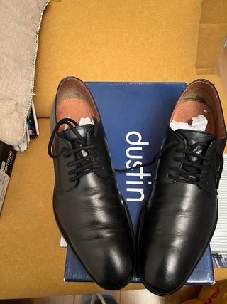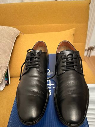 Scarpe eleganti in pelle sintetica. - Chiusura con lacci. - Design classico. - Suola in gomma. - La zona dei talloni si è pelata (ultima foto), da qui il prezzo.