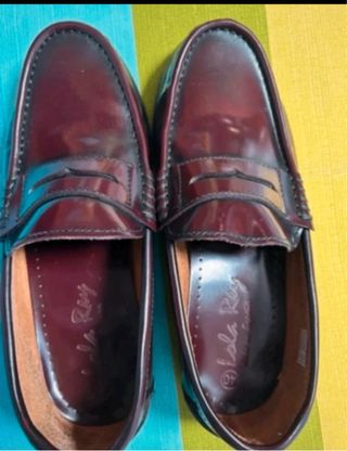 Scarpe eleganti della marca Lola Rey. Design classico tipo mocassino. Finitura brillante in marrone. Dettaglio mascherina sulla tomaia. Interno con logo del marchio.